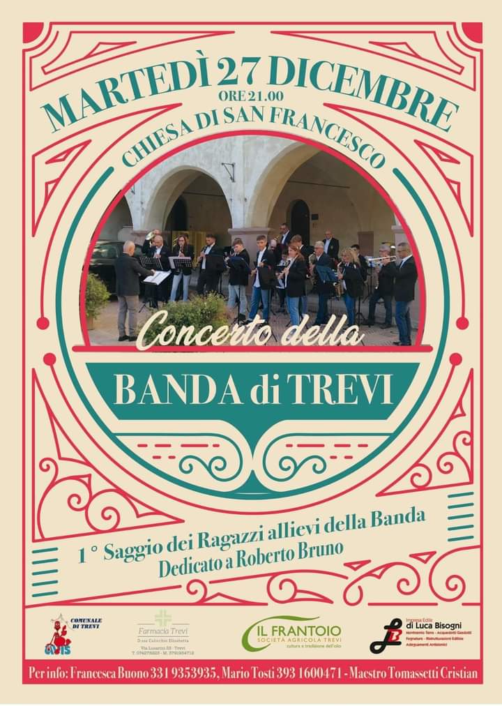 Martedì 27 Dicembre alle ore 21:00 nella Chiesa di San Francesco si terrà il concerto della Banda di Trevi