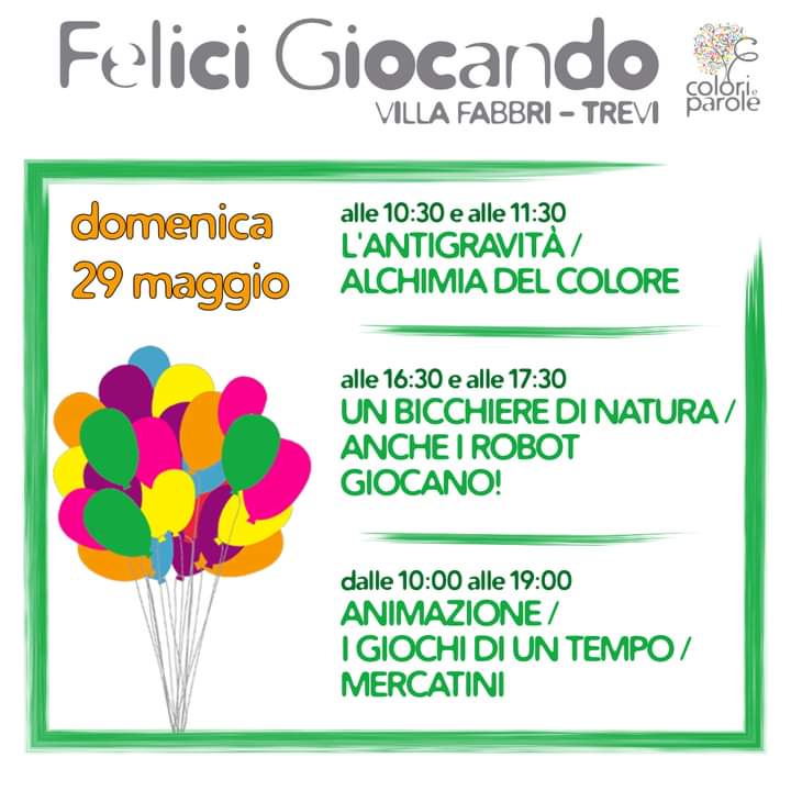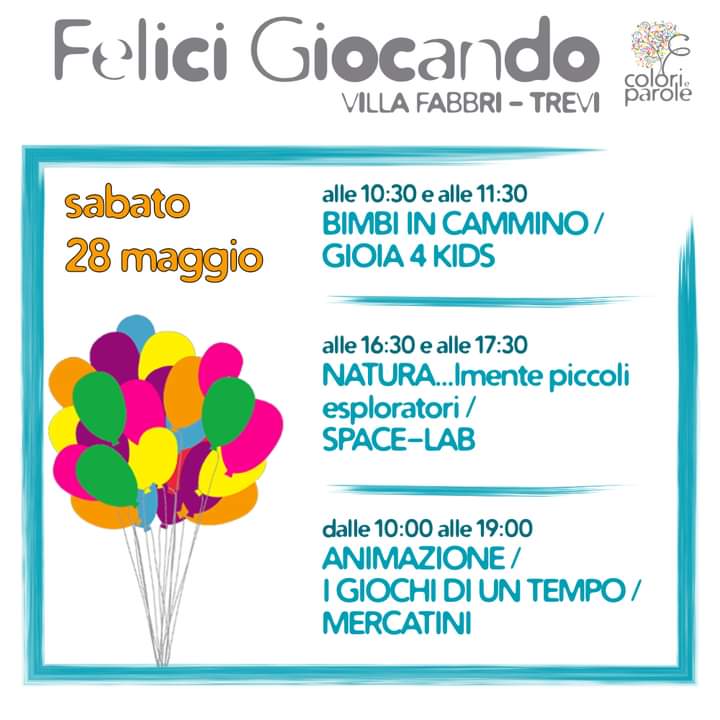 Il 28 e 29 maggio torna “Felici Giocando”! A Villa Fabri (Trevi), laboratori gratuiti e mercatini. Un’occasione per incontrarsi, giocare, approfondire, conoscersi e riconoscersi. Nei prossimi giorni verranno pubblicate tutte le attività previste per questa edizione.